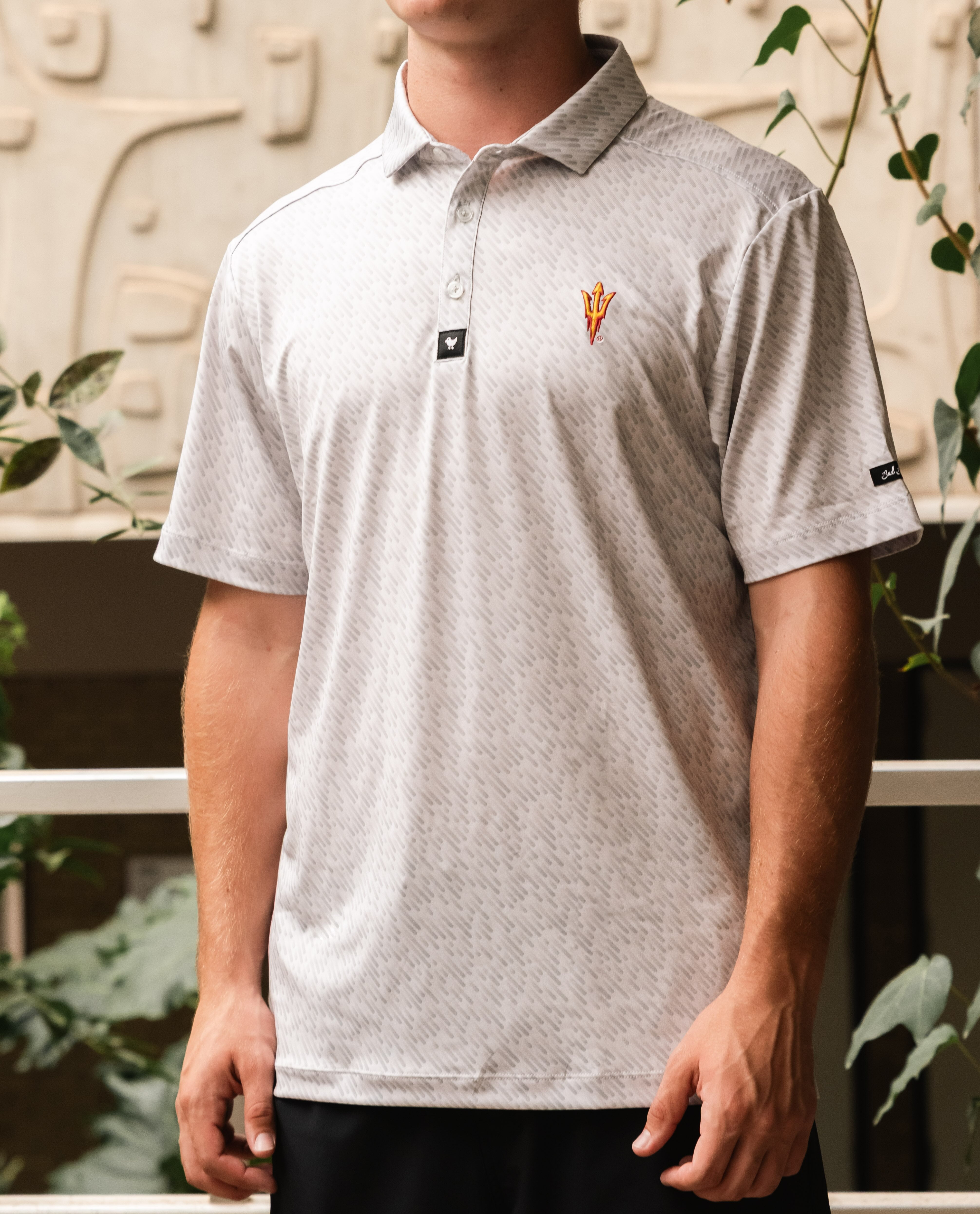 Chaos never looked this organized. This grey Cosmic Chaos polo features ASU Pitchforks scattered across our wildest pattern yet, officially licensed and engineered to start conversations on the first tee. Performance fabric handles the heat, the design handles your trash talk responsibilities.